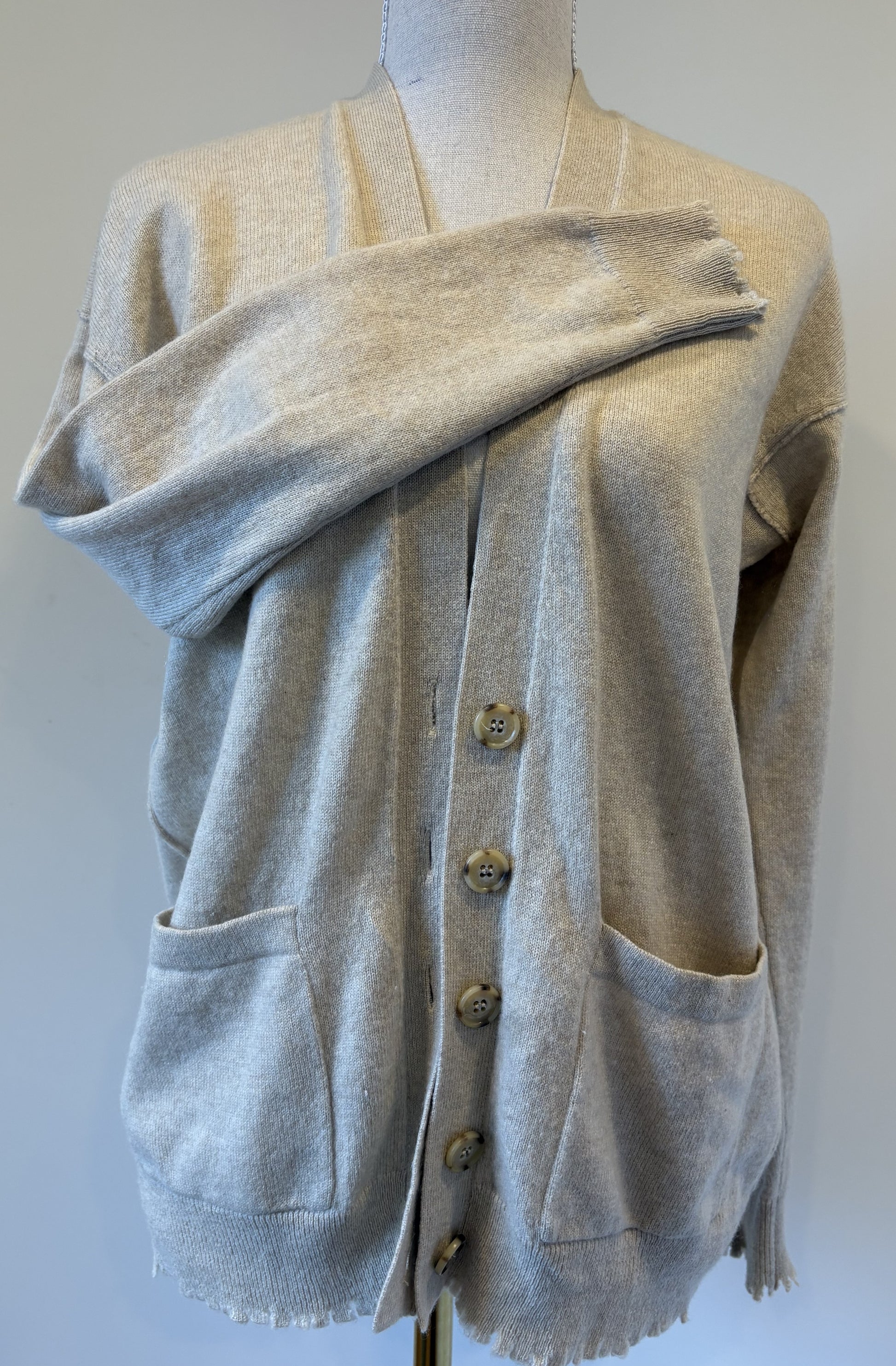 CONDITION: Good, preloved condition. A little bobbly in places, but overall good condition. It has an intentional ragged finish to the hem and cuff, tortoiseshell buttons.